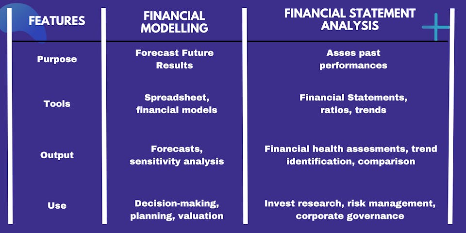 A) The main difference between financial modeling and financial statement analysis is that financial modeling is a predictive tool, while financial statement analysis is a diagnostic tool. Financial modelling is used to forecast future results, while financial statement analysis is used to assess a company's past performance.